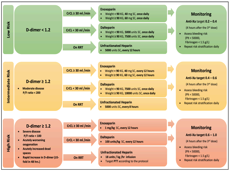 HIGH-RISK GROUP: D-Dimer ≥ 1.2 mg/L, P/F ratio < 100, acutely worsening oxygenation or increasing dead space or rapid increase in D-Dimer ( ≥ 5 folds in 48 hours).